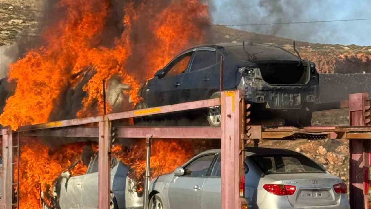 Hatay’da bulunan Cilvegözü Sınır Kapısı’ndan Suriye’ye geçmeyi bekleyen tırda yüklü araçlar alevlere teslim oldu. Yangında 6 araç yanarak kullanılamaz hale geldi.
