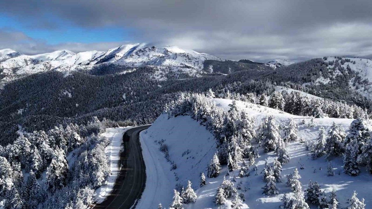 Kar yağışının ardından kristalize olan ağaç dalları ve bembeyaz örtüyle kaplanan dik yamaçlar, havadan çekilen görüntülerle bölgenin doğal güzelliğini bir kez daha kanıtladı.