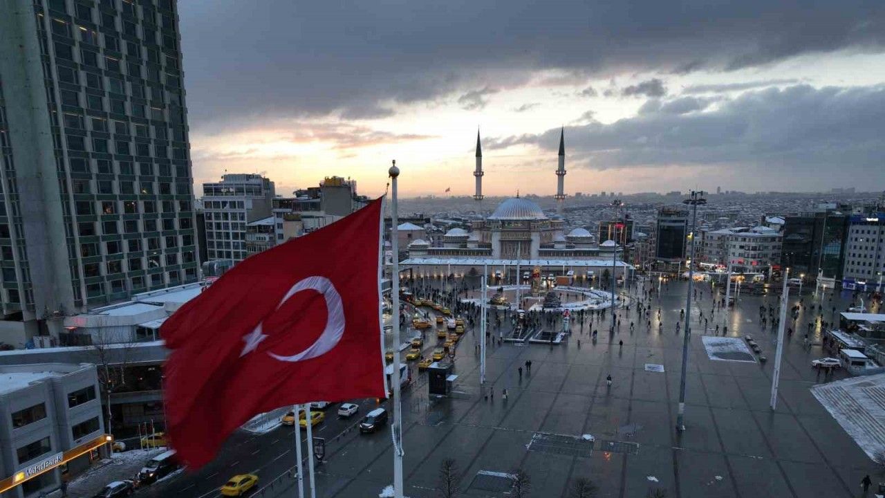 Beyaz örtüye bürünen İstanbul’un sembol yerlerinden Taksim Meydanı, İstiklal Caddesi ve çevresi havadan görüntülendi. Gün batımında kızıla bürünen gökyüzünden bir yandan kar fırtınası devam ederken diğer yanda eşsiz manzaralar oluştu. Beyaz ve kızıl renklerin hakim olduğu şehrin gökyüzü görenleri kendine hayran bıraktı. Taksim Camii’nin havanın kararması ile birlikte aydınlatmaları açıldı. Gün batımı manzarası ve beyaza bürünen Taksim Camii yerli ve yabancı turistlerinde ilgi odağı oldu. Bir çok vatandaş o anları cep telefonlarından kayıt altına aldı.