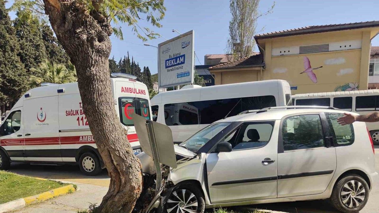 Kuşadası’nda bugün yaşanan olayda 80 yaşındaki Mesut Ö., seyir halindeyken yayalara çarpmamak için otomobilinin direksiyonunu refüje kırarak ağaca çarptı, kazada sürücü yaralandı.