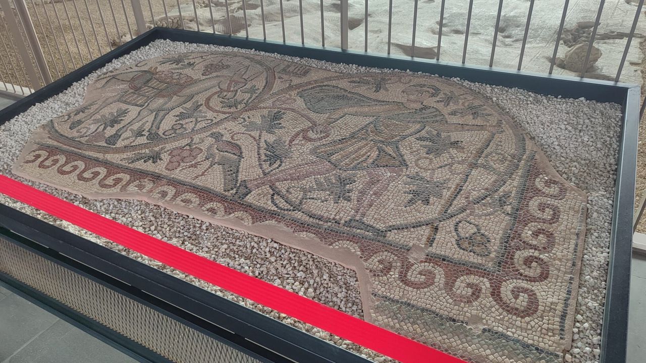 Mozaik, milattan sonra 5’inci ve 6’ncı yüzyıllara tarihlenen üç nefli bir kilise tabanına ait. Mozaik üzerinde asma dalları arasında, üzüm hasada sonrasında eşeğe yüklenen üzümlerin taşınması betimlenmiştir. Bu mozaik üzerinde betimlenen üzüm hasadı geçmişten günümüze kadar olan zaman dilimi içinde bölgede süregelen üzüm yetiştiriciliği açısından da önemlidir.