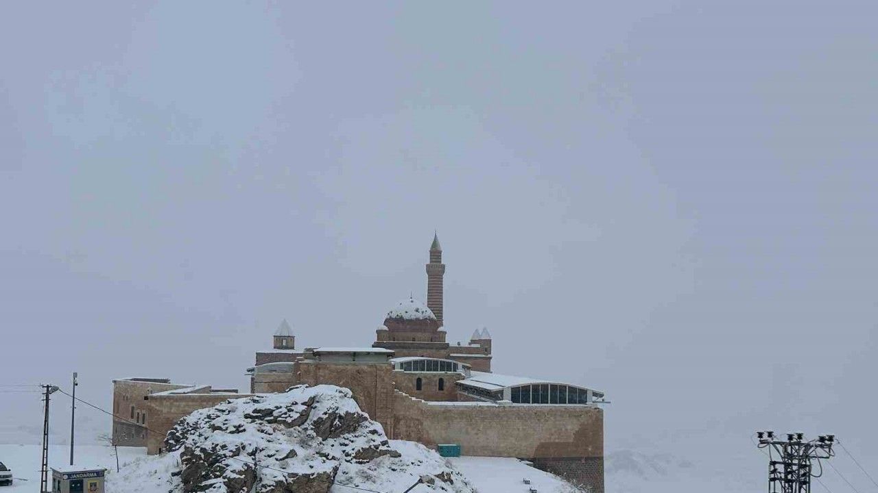 Ağrı’nın Doğubayazıt ilçesinde yer alan ve Osmanlı mimarisinin en önemli eserleri arasında gösterilen İshak Paşa Sarayı, etkili olan kar yağışıyla birlikte beyaza büründü. Tarihi yapı, karla bütünleşen ihtişamlı görünümüyle ziyaretçilerine görsel bir şölen sundu.