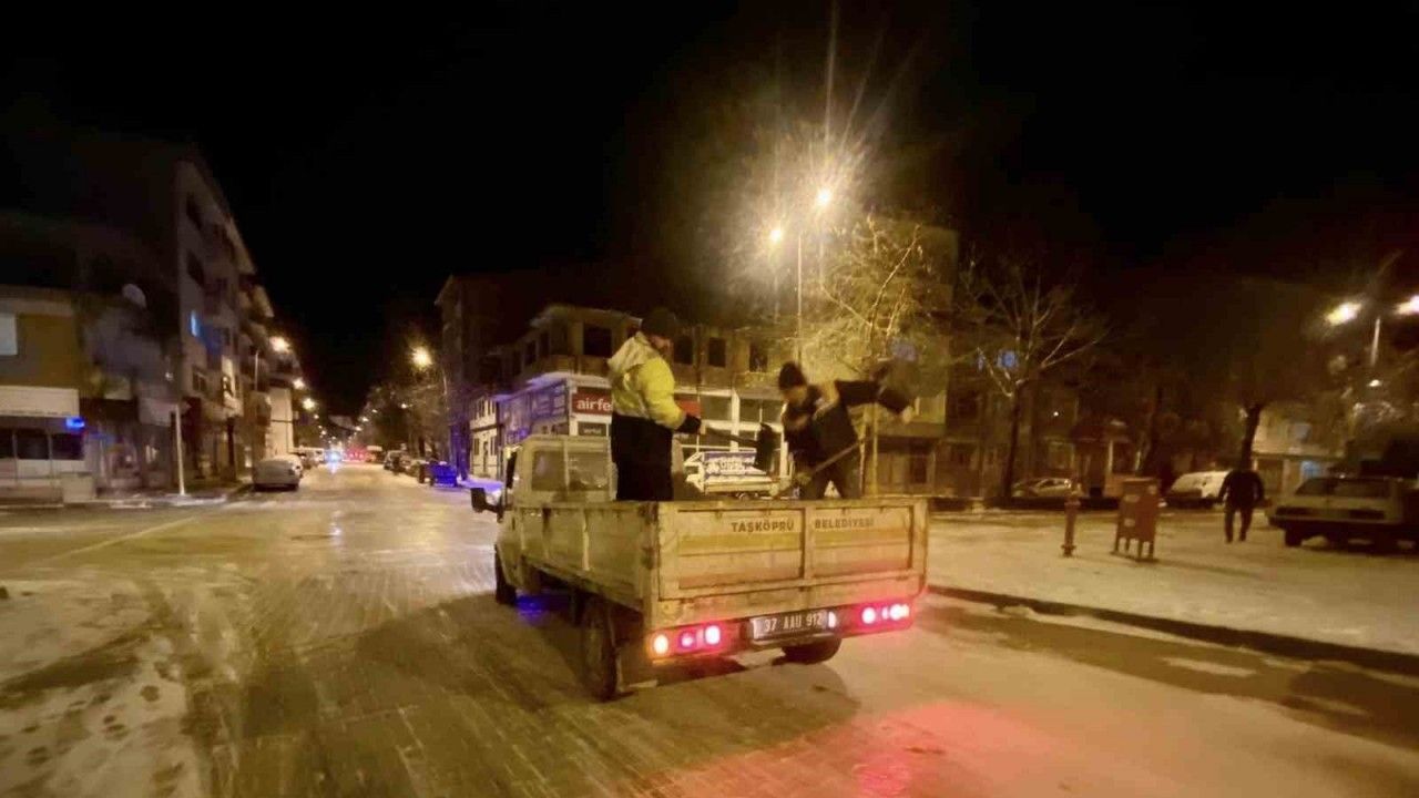 Taşköprü Belediyesi, cadde ve sokaklarda karla mücadele ve kumlama çalışması başlattı.