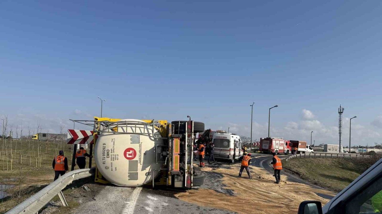 TEM Otoyolu İstanbul Çatalca Gişeleri mevkiinde virajı alamayan atık madde yüklü tanker devrildi. Yaralanan tanker sürücüsü hastaneye kaldırılırken bölgede uzun süre trafik yoğunluğu yaşandı.