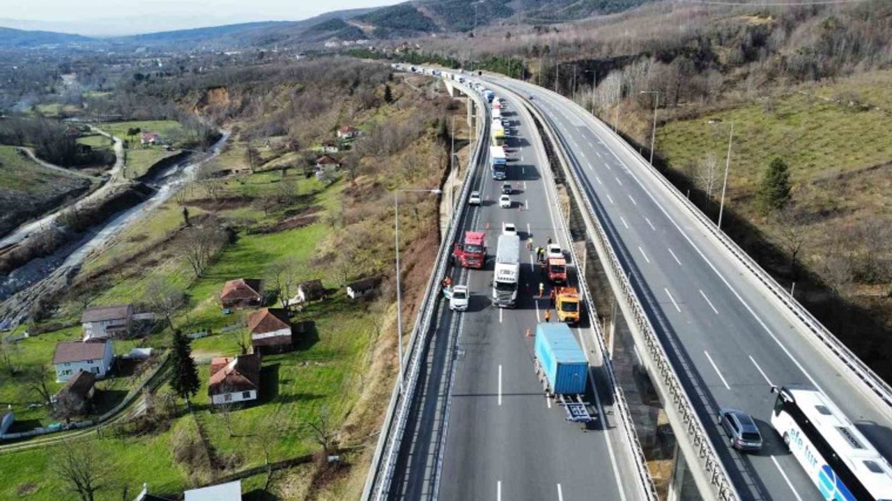 Kaza, Anadolu Otoyolu Kaynaşlı viyadükler mevkisinde meydana geldi. Alınan bilgilere göre, İstanbul’dan Ankara istikametine seyir halinde olan Tuncay A. idaresindeki 34 TM 1980 plakalı soda yapımında kullanılan ham madde yüklü tır, viyadükler mevkiinde sürücüsünün fren yapması sebebi ile dorse yerinden koparak yola savruldu. Kaza sebebi ile kısa süreli trafiğe kapalı kalan yol Bölge Trafik ekiplerinin çalışması ile tek şeritten açıldı. Kaza sebebi ile Ankara istikametine kilometrelerce kuyruk oluşurken, bölgeye çağrılan vinç ile dorsenin kaldırılması çalışmalarına başlandı. Öte yandan, kaza ve uzun araç kuyruğu dron ile havadan görüntülendi.