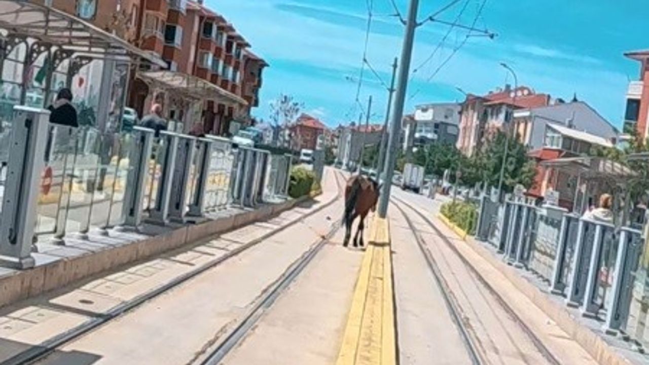 Eskişehir’de yaşayan Bedirhan Canpolat, motosikleti ile 71 Evler Mahallesi’nde bulunan 71 Evler tramvay durağının yanında seyir halindeyken ilginç bir durum fark etti. Tramvayın geçtiği rayların üzerinde başıboş bir at fark etti. Canpolat’ın kask kamerası tarafından kaydedilen görüntülerde, atın rayların üzerinde tramvay durağının yanında dolaştığı görüldü. Durakta bekleyen yolcuların hayretle karşıladığı olayda atın, rayların üzerinde ilerlemeye devam ettiği görülüyor.