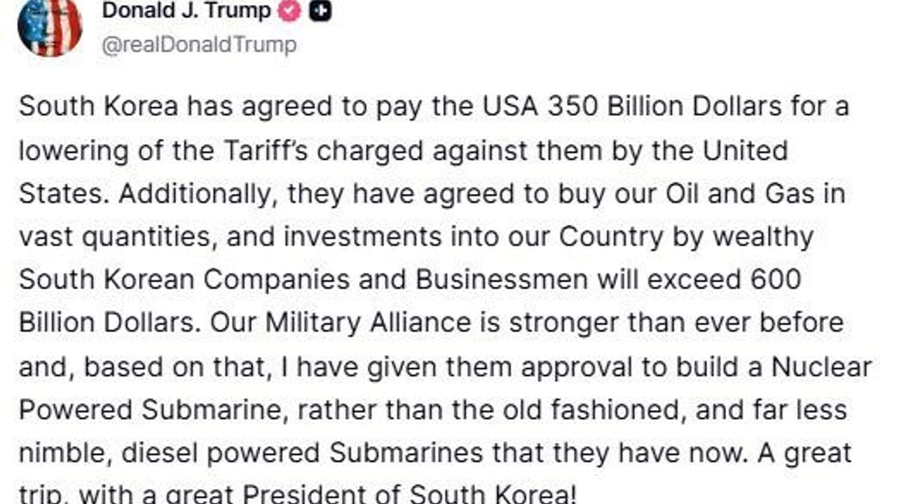 ABD Başkanı Donald Trump, kendisine ait Truth sosyal medya platformundan, dün Güney Kore’de yürüttüğü diplomatik temasların sonuçlarına dair açıklamalarda bulundu. Gümrük vergilerinin düşürülmesi karşılığında Güney Kore’nin ABD’ye 350 milyar dolarlık yatırım yapmayı kabul ettiğini belirten Trump, "Ayrıca, bizden büyük miktarda petrol ve doğalgaz satın alma ve zengin Güney Koreli şirketler ile iş insanlarının ABD’ye 600 milyar doları aşkın yatırım yapması konusunda da mutabık kaldılar" ifadelerini kullandı.