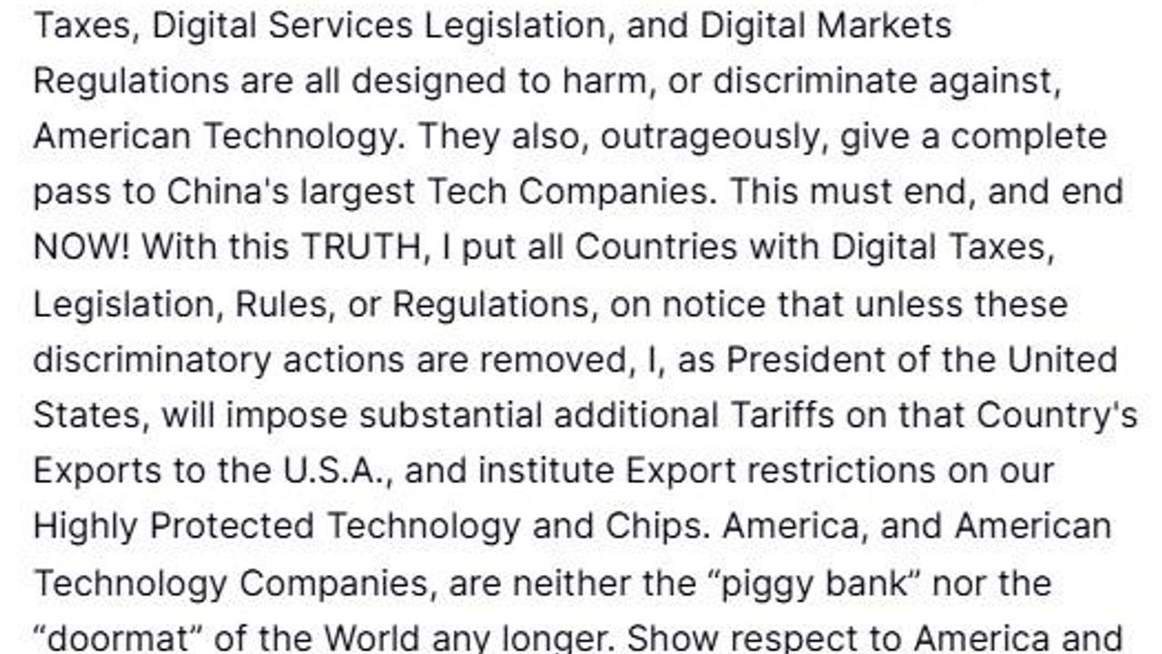 ABD’li teknoloji şirketlerini olumsuz etkileyen uygulamalara başvuran ülkelere seslenen Trump "ABD Başkanı olarak, dijital vergiler, mevzuatlar, kurallar veya düzenlemeler uygulayan ülkeler bu ayrımcı uygulamalara son vermedikleri takdirde, ABD ile yaptıkları ihracata ek gümrük vergileri getireceğim ve yüksek koruma altındaki teknolojilerimiz ve çiplerimiz üzerinde ihracat kısıtlamaları uygulayacağım" dedi. Dünya ülkelerinin artık ABD ve şirketlerinden haksız şekilde faydalanamayacağını vurgulayan Trump, "Amerika ve Amerikan teknoloji şirketleri artık dünyanın ‘kumbarası’ ya da ‘paspası’ değildir. Amerika’ya ve muhteşem teknoloji şirketlerimize saygı gösterin, yoksa sonuçlarına katlanmak zorunda kalırsınız!" uyarısında bulundu.
