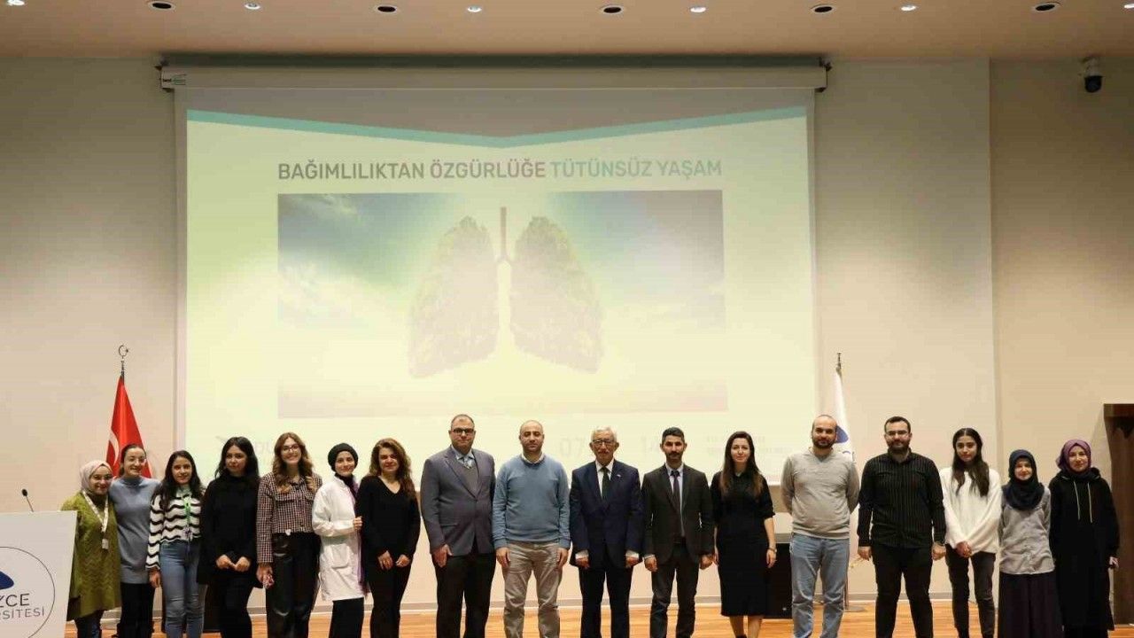 Düzce Üniversitesi Bağımlılıkla Mücadele Araştırma ve Uygulama Merkezi (DÜBAM) tarafından 9 Şubat Dünya Sigarayı Bırakma Günü dolayısıyla düzenlenen "Bağımlılıktan Özgürlüğe, Tütünsüz Yaşam" başlıklı konferansı gerçekleştirildi.