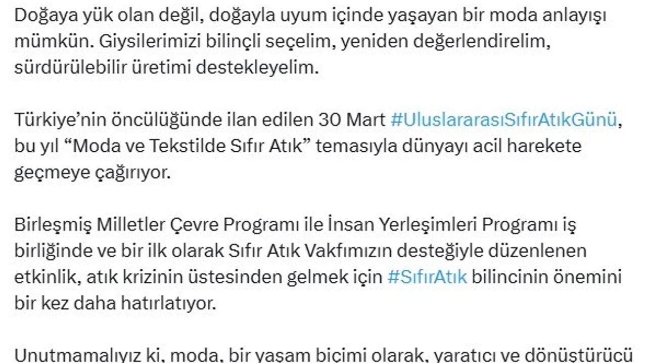 "Türkiye’nin öncülüğünde ilan edilen 30 Mart Uluslararası Sıfır Atık Günü, bu yıl ’Moda ve Tekstilde Sıfır Atık’ temasıyla dünyayı acil harekete geçmeye çağırıyor. Birleşmiş Milletler Çevre Programı ile İnsan Yerleşimleri Programı işbirliğinde ve bir ilk olarak Sıfır Atık Vakfımızın desteğiyle düzenlenen etkinlik, atık krizinin üstesinden gelmek için sıfır atık bilincinin önemini bir kez daha hatırlatıyor. Unutmamalıyız ki moda, bir yaşam biçimi olarak özgün ve dönüştürücü ruhuyla çözümün kalbinde yer alıyor."