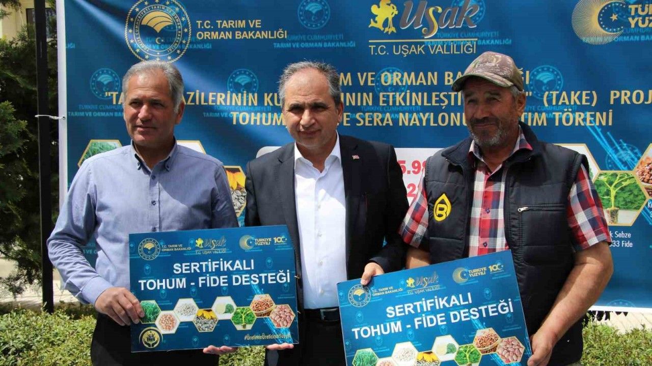 Uşak’ta Tarım Arazilerinin Kullanımının Etkinleştirilmesi ve Organik Toprak Düzenleyicisi Kullanımının Yaygınlaştırılması projeleri kapsamında çiftçilere tohum, fide, sera naylonu ve hümik asit dağıtım töreni gerçekleştirildi.