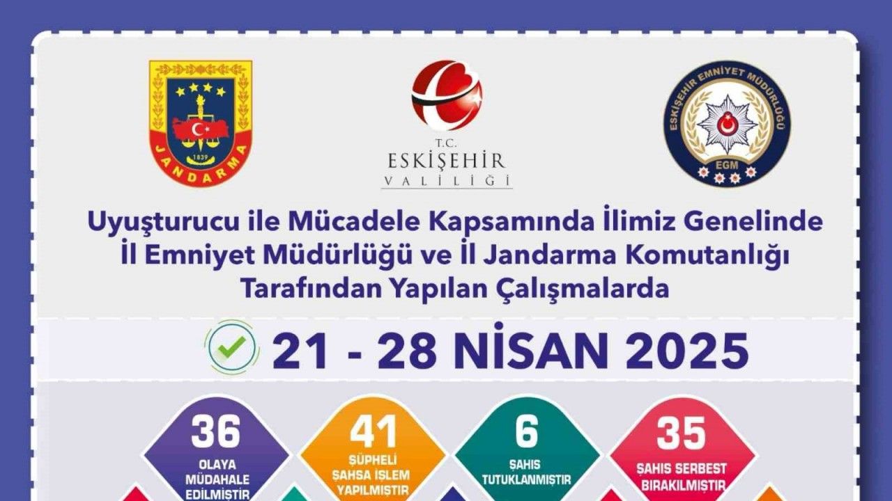 Edinilen bilgilere göre, İl Emniyet Müdürlüğü ve İl Jandarma Komutanlığı ekiplerince uyuşturucu ile mücadele çerçevesinde yapılan çalışmalar sürüyor. Kent genelinde 21-28 Nisan tarihleri arasında gerçekleştirilen çalışmalarda 36 olaya müdahale edildi. Ekiplerce 41 şüpheli şahsa işlem yapılırken, 6 şahıs tutuklandı ve 35 şahıs serbest bırakıldı. Yapılan aramalarda ise, 8,51 gram metamfetamin, 80 adet sentetik ecza hapı, 8,71 gram esrar, 2 adet uyuşturucu kullanma aparatı, 142,46 gram bonzai ve 1 adet hassas terazi ele geçirildi.