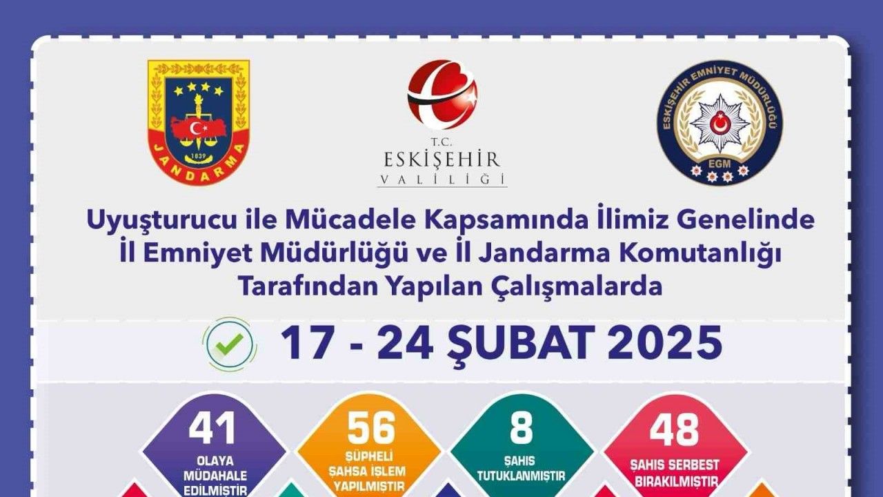 Edinilen bilgilere göre, Eskişehir İl Emniyet Müdürlüğü ve Eskişehir İl Jandarma Komutanlığı ekiplerince uyuşturucu ile mücadele kapsamında çeşitli çalışmalar yapıldı. 17-24 Şubat 2025 tarihlerinde gerçekleştirilen çalışmalar sonucunda; 65,26 gram metamfetamin maddesi, 0,38 gram esrar maddesi, 164,74 gram bonzai maddesi, 19 gram eroin, 184 adet sentetik ecza hapı, 204 adet ecstasy hap ve 1 adet hassas terazi ele geçirildiği belirtildi. Çalışmalar kapsamında ayrıca 41 olaya müdahale edilirken; 56 şüpheli şahsa işlem uygulandığı, 8 şahsın tutuklandığı ve 48 şahsın ise serbest bırakıldığı aktarıldı.