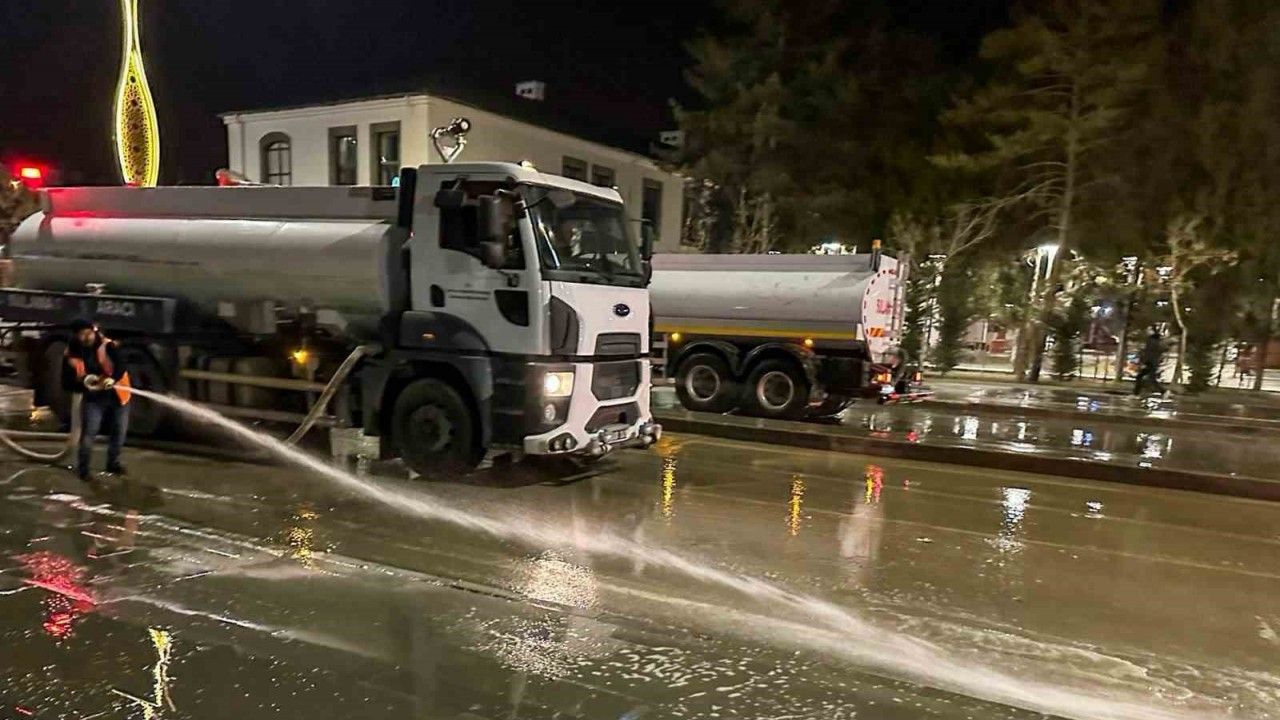 Ardından ekipler basınçlı su ile caddelerde detaylı yıkama işlemi yapıyor.