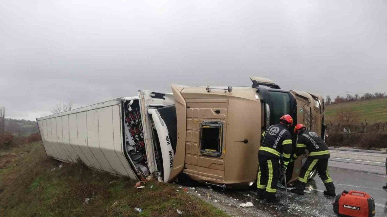 Kısa sürede olay yerine gelen itfaiye ekipleri, devrilen tırda mahsur kalan yaralıyı ön camı kırarak çıkarıp sağlık ekiplerine teslim etti. Sağlık ekipleri sürücüye olay yerinde ilk müdahaleleri yaptıktan sonra ambulans ile hastaneye sevk etti. Hastaneye sevk edilen yaralının durumu iyi olduğu öğrenildi.