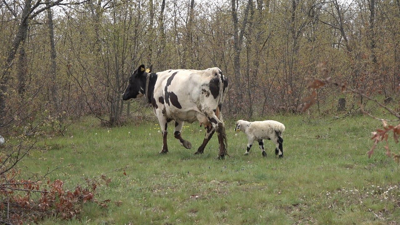 Yozgat’ta buzağısını kaybeden inek, annesi ölen kuzuyu sahiplendi. İnek ve kuzu arasındaki bağ, görenleri duygulandırdı.