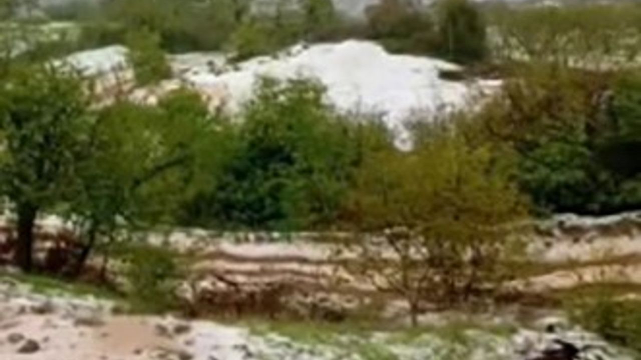 İzmir’in Ödemiş ilçesinde etkili olan sağanak yağışın ardından başlayan dolu yağışı nedeniyle, Küre Mahallesi’ndeki dağlık araziler beyaza büründü.