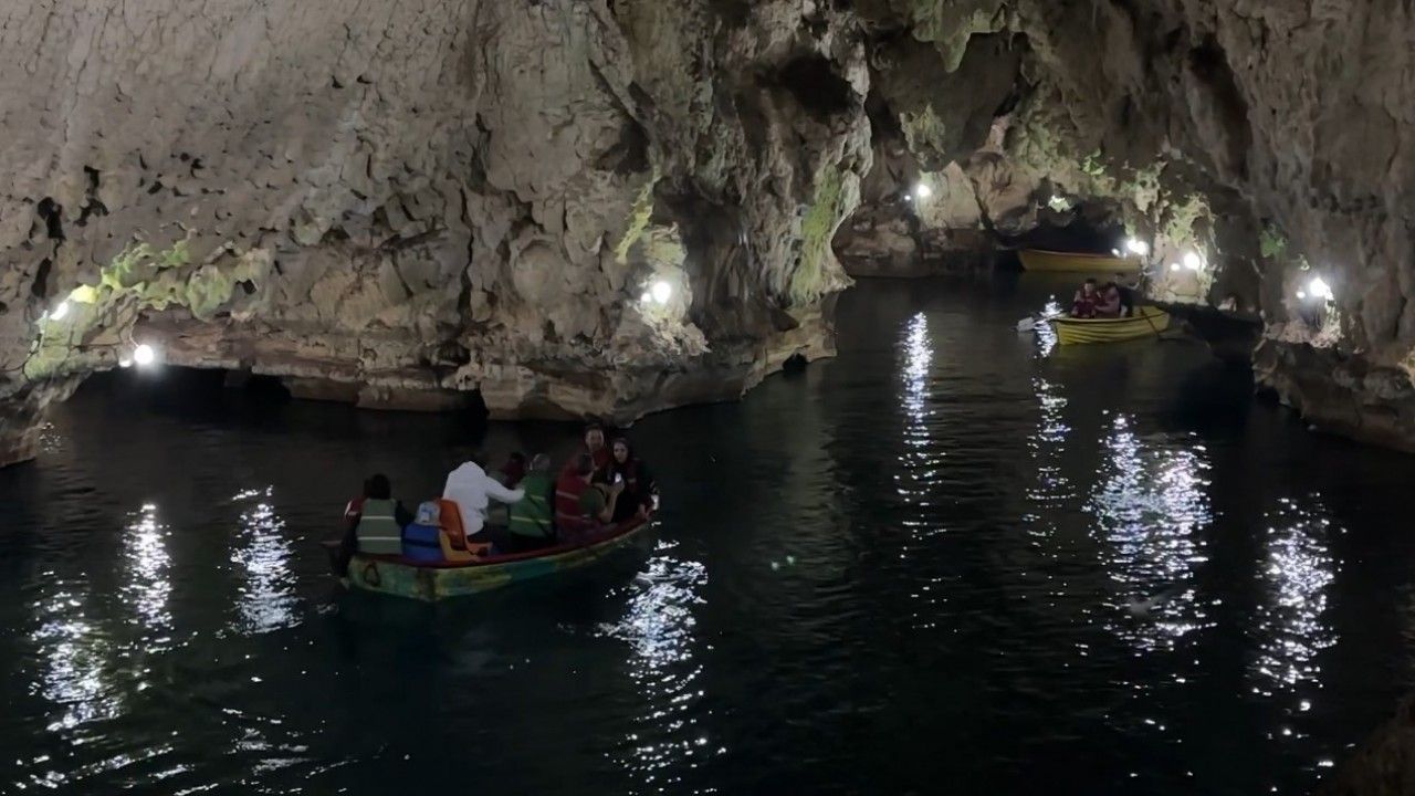 Hakkari’nin Yüksekova ilçesinden İran’a gelen 18 kişilik turist grubu, Mahabad şehrindeki Saholan Mağarası’nın 80 metre derinliğindeki gölde kayıkla tur yapmanın keyfini çıkardı.