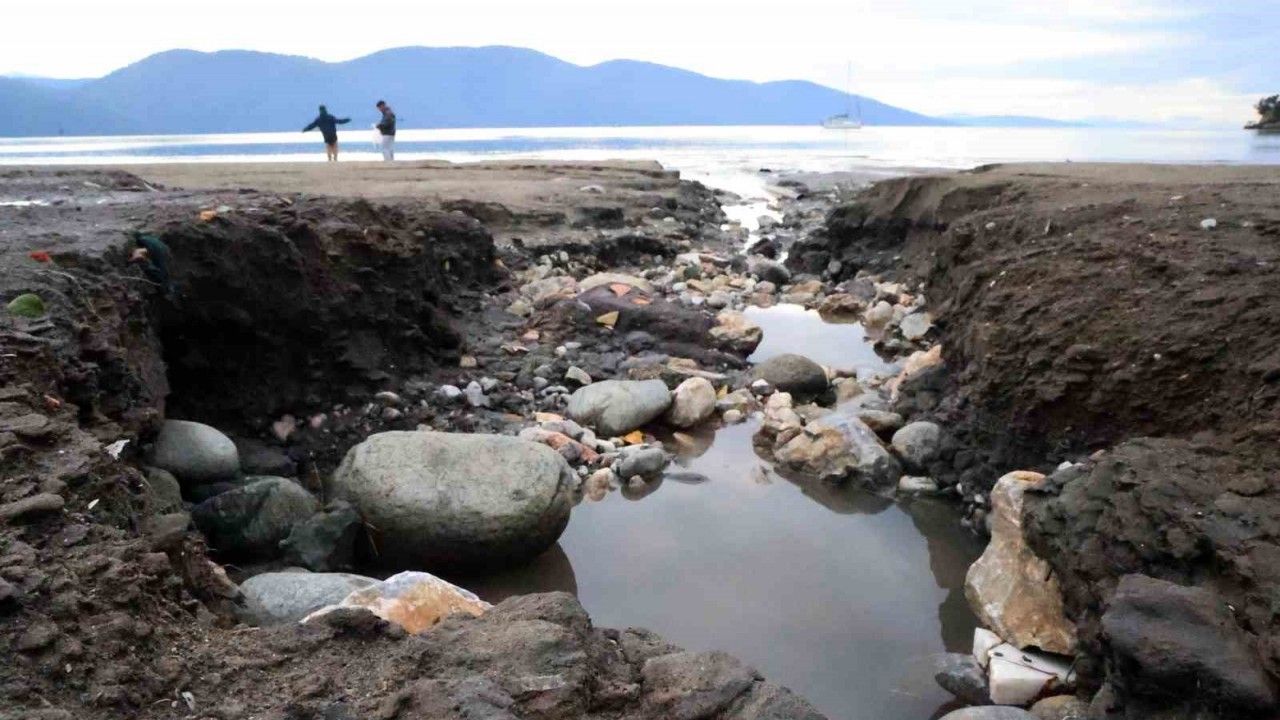 Gece saatlerinde başlayan sağanak yağmur öğle saatlerinde sona ererken, yağış nedeniyle Akyaka Mahallesi’nin iç kesimlerinden gelen yağmur suyu 300 metre uzunluğundaki Akyaka sahilinde sahil kumları denize sürüklendi ve sahilde yarıklar oluştu.