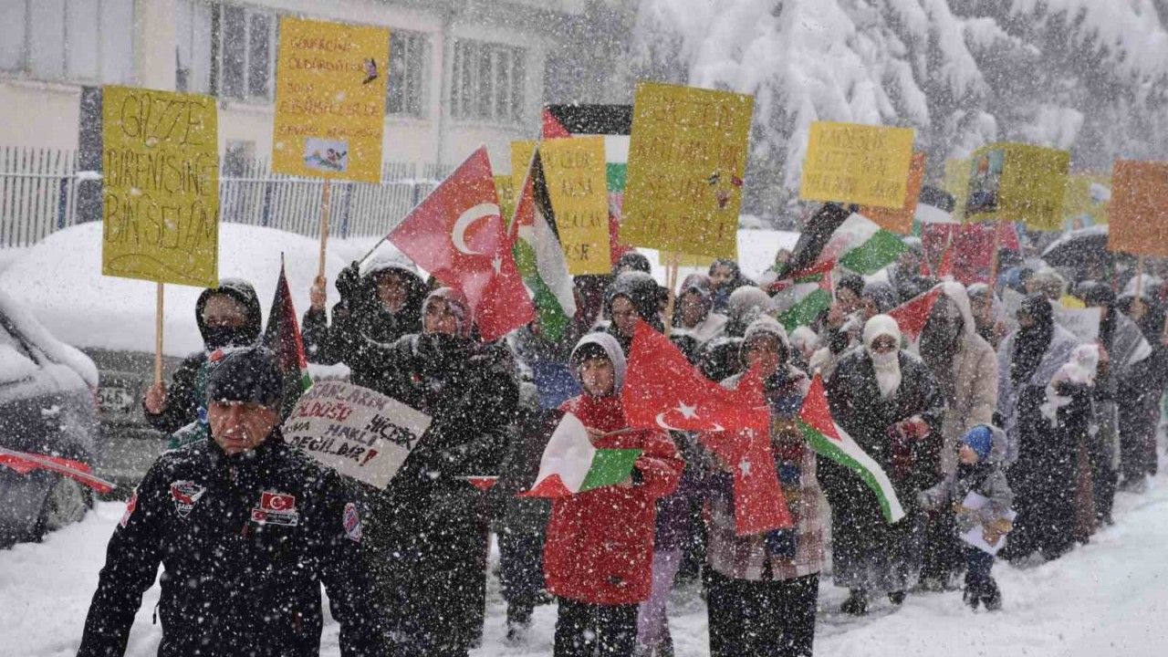 Sakarya’da 152 sivil toplum kuruluşunun katılımıyla yoğun kar yağışı altında ‘Gazze Direnişine Destek Zamanı’ mitingi düzenlendi.