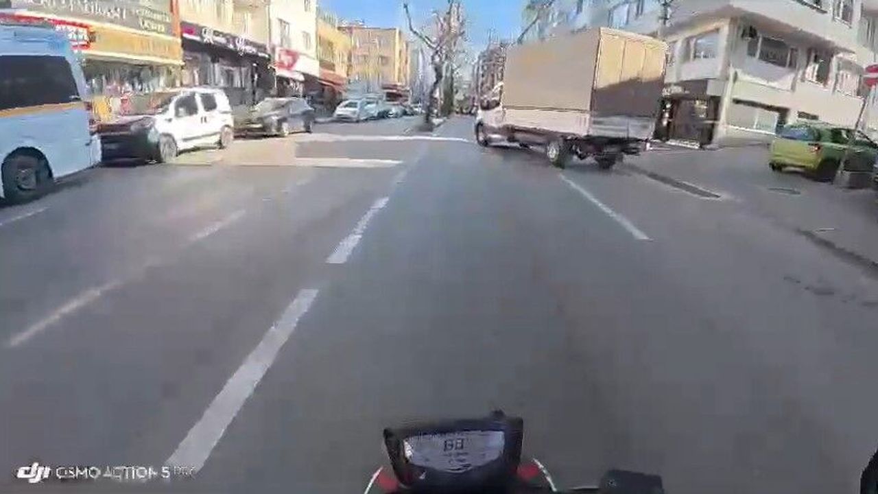 Bursa’da cadde üzerinde ilerleyen motosikletli, yola aniden çıkan kamyonete çarpmamak için manevra yapıp ters yöne girdi. Karşı taraftan gelen otobüse çarpıp durabilen sürücü, facianın eşiğinden döndü. O anlar kameraya yansıdı.