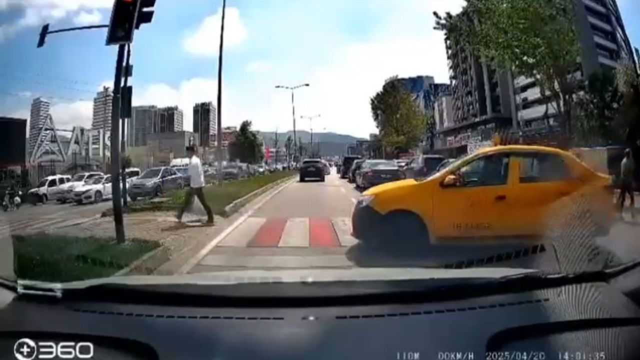 Olay, merkez Nilüfer ilçesi Lefkoşa Caddesi üzerinde meydana geldi. Sürücüsü henüz öğrenilemeyen 16 T 0832 plakalı taksi, yolu uzatmamak için yaya geçidini kullandı. Yaya geçidinde ilerleyen vatandaşları hiçe sayan şoför, ışık ihlali de yaparak yoluna devam etti. İlginç anlar, saniye saniye araç içi kamerasına yansıdı.