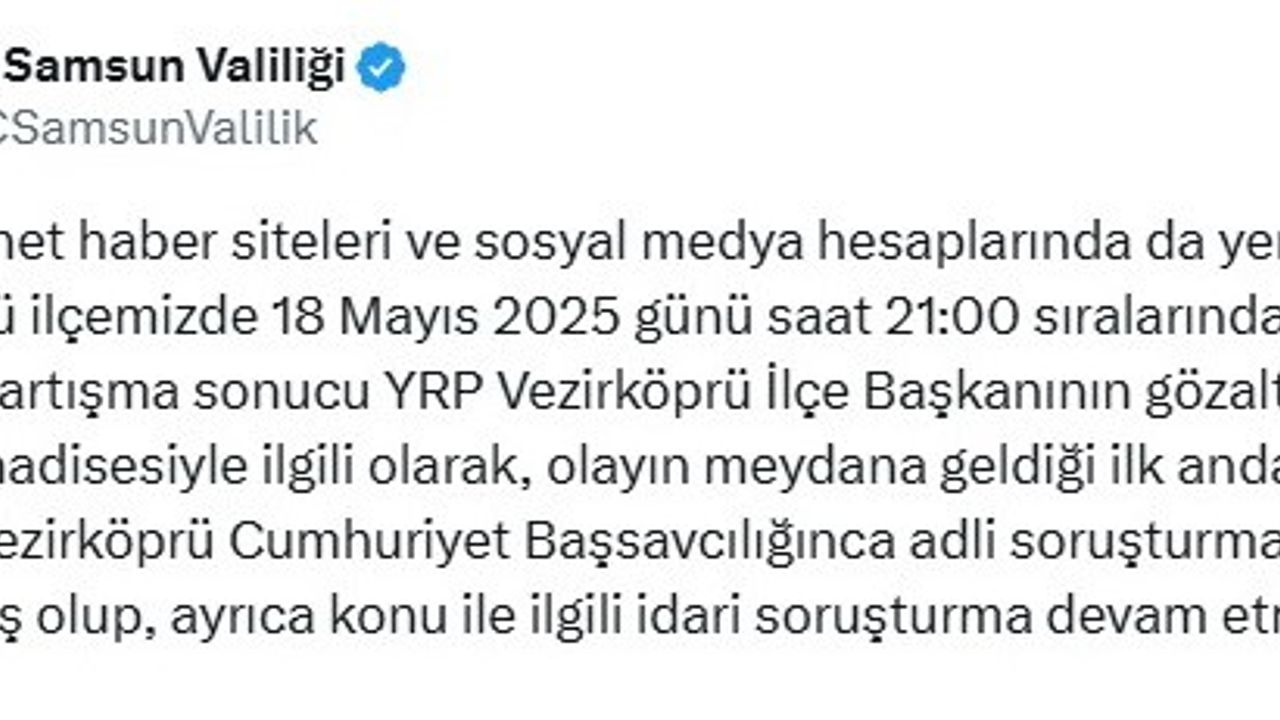 Konuya ilişkin Samsun Valiliği tarafından sosyal medya hesabından yapılan açıklamada, "Bazı internet haber siteleri ve sosyal medya hesaplarında yer alan; Vezirköprü ilçemizde 18 Mayıs günü saat 21.00 sıralarında trafikte yaşanan tartışma sonucu YRP Vezirköprü İlçe Başkanının gözaltına alınması hadisesiyle ilgili olarak, olayın meydana geldiği ilk andan itibaren Vezirköprü Cumhuriyet Başsavcılığınca adli soruşturma başlatılmış olup, ayrıca konu ile ilgili idari soruşturma devam etmektedir" ifadelerine yer verildi.
