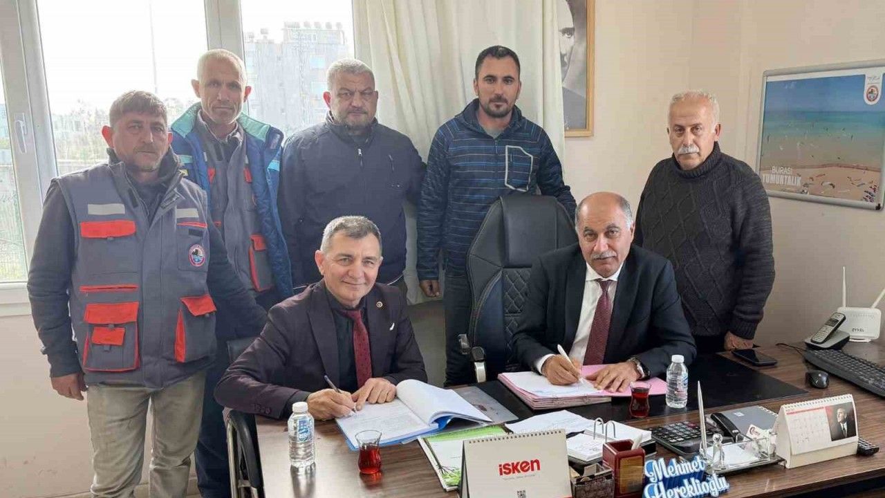 Yumurtalık Belediye Başkanı Erdinç Altıok, işçilerle birlikte toplu iş sözleşmesini imzaladı.